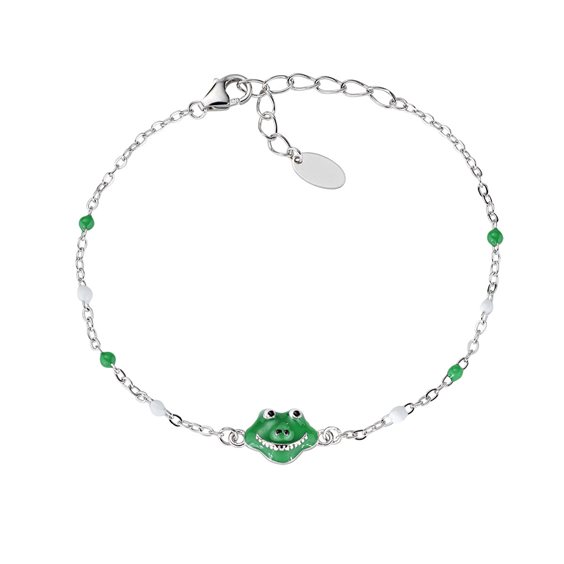 Bracciale Junior con Rana in Argento e Smalto Bracciale in argento 925 rodiato con charm e smalto verde, bianco e nero. Lunghezza regolabile da 12 a 15 cm, chiusura a moschettone.