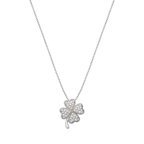 Collana Quadrifoglio Zirconato Collana in AG925 e e zirconi bianchi - Rodio - Lunghezza 40 + 4cm - charm Ø 1cm