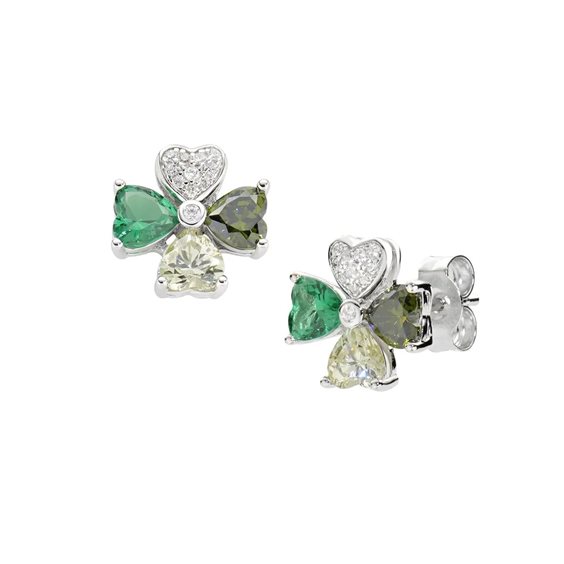 Orecchini Quadricuore Verde Multicolor Orecchini a lobo in argento 925 con Quadricuore composto da zirconi bianchi e zirconi taglio cuore verde smeraldo, verde chiaro e verde oliva.