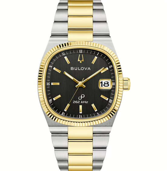 Orologio unisex Solo Tempo modello Super Seville. Cassa e bracciale bicolore in acciaio lucido e spazzolato design vintage a cassa "TV", lunetta zigrinata lucida placcata oro giallo. Movimento al quarzo High Precision 262kHz una tecnologia brevettata da Bulova. La sua precisione straordinaria consente alla lancetta dei secondi di scorrere con una fluidità rara, tratto distintivo di questa avanzata tecnologia. Vetro zaffiro con lente sulla data. Quadrante nero lancette lucide luminescenti indici applicati con punti luminosi data ad ore 3. Bracciale regolabile con chiusura deployante a scomparsa. Impermeabile 3 bar (3 atm) Scatola libretto e Garanzia 5 anni Originale.