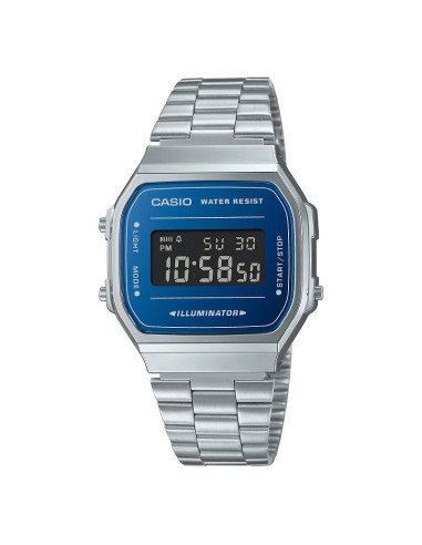 Orologio multifunzione Unisex CASIO della collezione VINTAGE con movimento al quarzo, cassa 36.3 mm in resina IP silver, spessore della cassa 9.6 mm, quadrante digitale blu a specchio, durata della batteria 7 anni, calendario automatico, retroilluminazione color blu/verde, cronometro, timer per conto alla rovescia, promemoria sonoro giornaliero e per il segnale orario e vetro minerale - Il cinturino è in acciaio inox e monta una chiusura scorrevole e regolabile con gancio a scatto - Lunghezza Cinturino: Regolabile da 14,5 a 20,5 cm