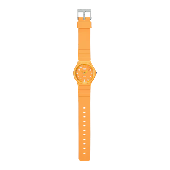Il modello MQ-24 che ha riscosso tanto successo è tornato, ora realizzato con materiali più rispettosi dell'ambiente. Il design delle lancette delle ore, dei minuti e dei secondi è caratterizzato da numeri indicatori semplici in una linea di diverse combinazioni di colori monocromatici, tutti lucidati per un look sottile e minimalista. Il cinturino è realizzato con resina a base biologica, un materiale ideato per contribuire a ridurre l'impatto ambientale.