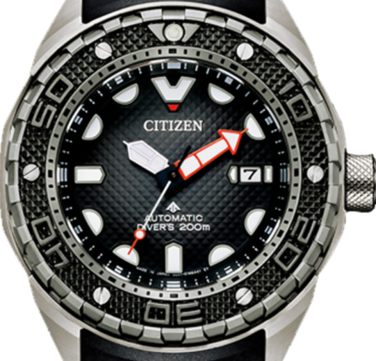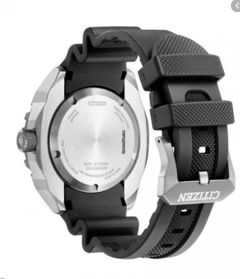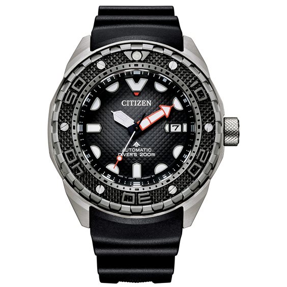 Orologio Solo Tempo Collezione Citizen Promaster Diver's automatico 200 mt. (certificato ISO). Cassa (resistenza magnetica 1600) in Super Titanium opaco spazzolato ghiera unidirezionale fondo e corona serrati a vite. Movimento meccanico automatico Citizen Cal. 9051 : 24 rubini 28800 battiti l'ora riserva di carica 42 ore. Quadrante nero antracite sfumato indici e lancette ad alta luminosità. Vetro zaffiro con trattamento antiriflesso. Cinturino in caucciù nero fibbia con ardiglione e prolunga per estensione muta. Impermeabile 20 bar (20 atm.) Scatola ( bombola ) e garanzia 5 anni originali