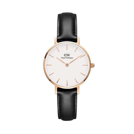 Orologio Solo Tempo Da Donna Di Daniel Wellington Della Collezione Classic Petit, Modello Sheffield. Orologio Con Cassa In Acciaio Di Colore Oro Rosè, Del Diametro Di 28 Mm E Dello Spessore Di 6 Mm. Modello Con Cinturino In Pelle Nera. Il Quadrante Di Questo Orologio È Di Colore Bianco Guscio D'Uovo Con Indici A Bastoni. Orologio Con Resistenza All'Acqua Fino A 3 Atm.