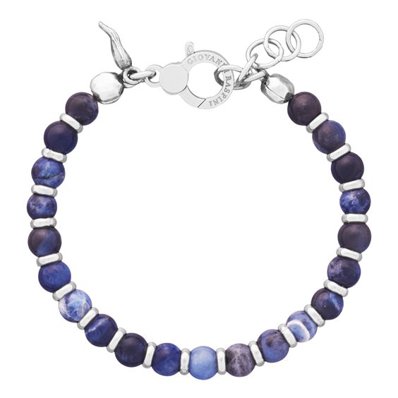 Il fascino delle pietre dure. Tante sferette in sodalite dialogano con piccoli elementi in argento fuso a cera persa e brunito per dar vita a questo bracciale. La parte minerale prevale sul decoro in argento, così che il colore diviene elemento primario. Fatto a mano in azienda.