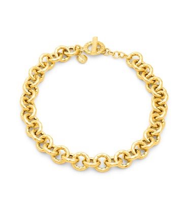 COLLANA PUEBLO CM 47 Una catena a maglia tonda in bronzo dorato con finitura martellata dà vita a una collana luminosa dalle calde sfumature. Impreziosita da una chiusura a T-bar, unisce eleganza e funzionalità. Realizzata a mano, esprime la perfetta armonia tra materia, luce e artigianalità.
