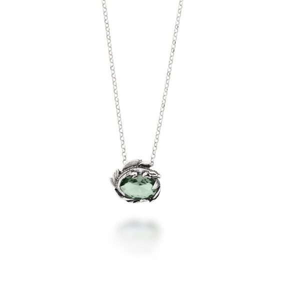 Questo elegante pendente fa dialogare un castone con coccodrillo in argento, realizzato a cera persa, con un grande quarzo color verde. Il gioiello è agganciato ad una catena mini-rolò diamantata e viene realizzato completamente in azienda.