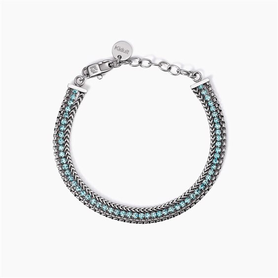 Bracciale regolabile in acciaio con due catene e tennis di cristalli azzurri. • Dimensione catena franco: 2 mm • Dimensione catena veneta: 2 mm • Diametro cristalli: 2 mm • Misura regolabile, lunghezza da 15,5 a 18,5 cm • Materiale: Acciaio 316L, Cristalli