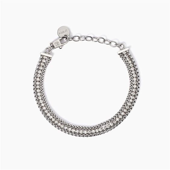 Bracciale regolabile in acciaio con due catene e tennis di cristalli bianchi. • Dimensione catena franco: 2 mm • Dimensione catena veneta: 2 mm • Diametro cristalli: 2 mm • Misura regolabile, lunghezza da 15,5 a 18,5 cm • Materiale: Acciaio 316L, Cristalli