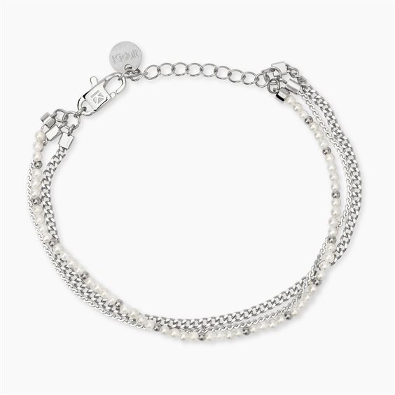 Bracciale in acciaio 316L, lunghezza regolabile da 16 a 19 cm, con catene serpentina e groumette diamantata, sfere e perle conchiglia. Dimensioni: serpentina 1.3 mm, groumette 2 mm, sfere Ø 2 mm, perle conchiglia Ø 2 mm