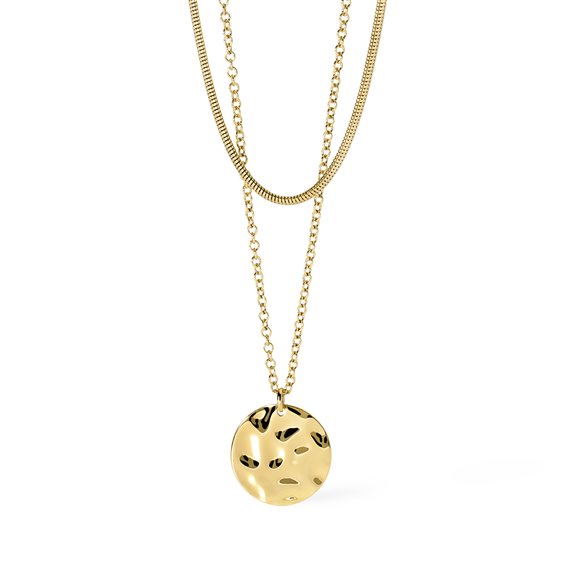 Girocollo regolabile in acciaio dorato con elemento tondo effetto martellato. • Dimensione catena rolò: 2 mm • Dimensione catena snake: 3 mm • Diametro pendente: 20 mm • Misura regolabile, lunghezza da 38 a 43 cm • Materiale: Acciaio 316L, PVD giallo