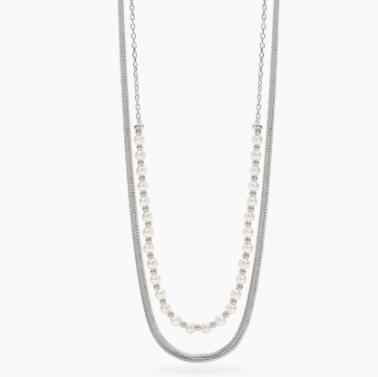 Girocollo in acciaio 316L, lunghezza regolabile da 38 a 43 cm, con catene rolò e snake, sfere e perle conchiglia. Dimensioni: rolò 1.5 mm, snake 2.7 mm, sfere Ø 2 mm, perla conchiglia Ø 3 mm