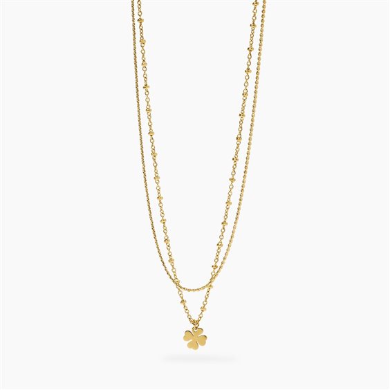 Girocollo in acciaio 316L e PVD giallo, lunghezza regolabile da 38 a 43 cm, con catene rolò e serpentina, pendente quadrifoglio. Dimensioni: rolò 1.6 mm, serpentina 1.3 mm, quadrifoglio 8x8 mm