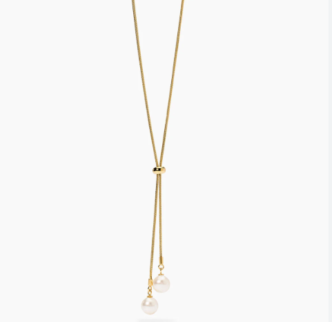 Collana in acciaio 316L e PVD giallo, lunghezza 70 cm, Ø interno 34 cm, con catena snake, slider e pendenti con perle conchiglia. Dimensioni: catena 1.2 mm, slider Ø 5.9 mm, perle conchiglia Ø 8 mm