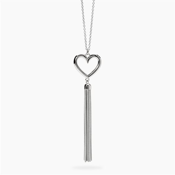 Collana in acciaio 316L, lunghezza 75 cm, con catena rolò e pendente cuore con catene snake. Dimensioni: larghezza rolò 2 mm, cuore 21x18.6 mm, larghezza snake Ø 1.2 mm