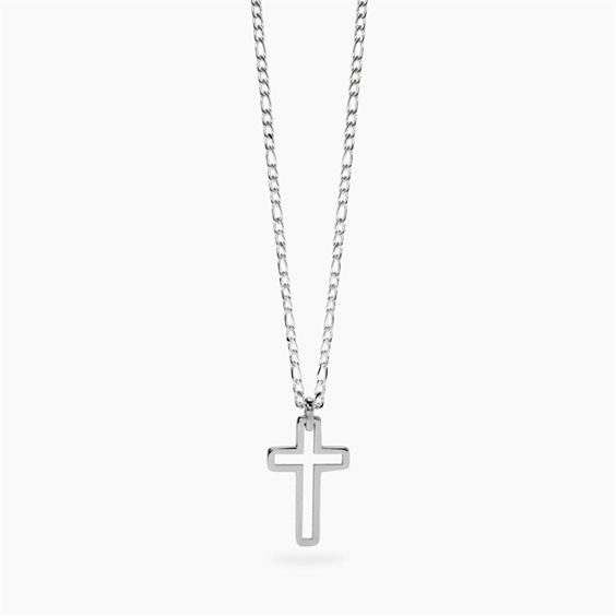 Collana in acciaio 316L, lunghezza 65 cm, con catena figaro e pendente croce. Dimensioni: larghezza catena 3 mm, croce 21x32.5 mm