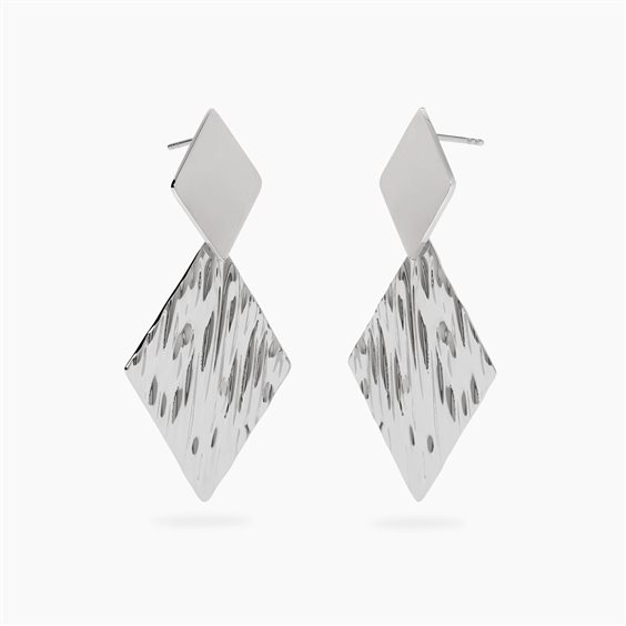 Orecchini in acciaio 316L, lunghezza totale orecchino 5.2 cm, con pendenti martellati. Dimensioni: elemento superiore 13.2x20 mm, pendente 24.7x35.7 mm