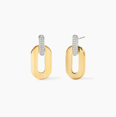 Orecchini in acciaio 316L e PVD giallo, lunghezza totale orecchino 3.2 cm, con pendenti allungati e cristalli. Dimensioni: elemento superiore 4x15 mm, pendente 15x25 mm, pietre Ø 1.25 mm