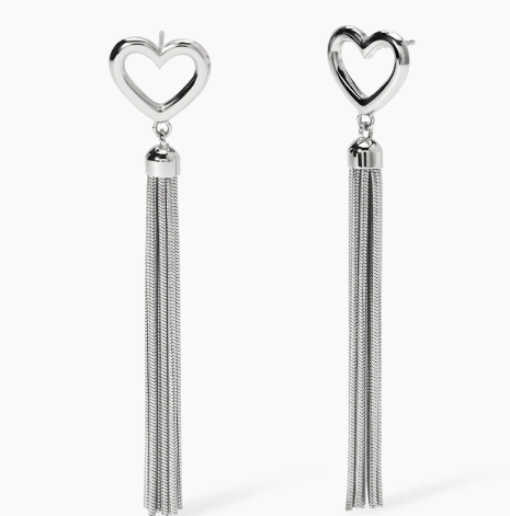 Orecchini in acciaio 316L, lunghezza totale orecchino 7.1 cm, con elemento cuore e catene snake pendenti. Dimensioni: cuore 15.5x13.9 mm, catene Ø 1.2 mm