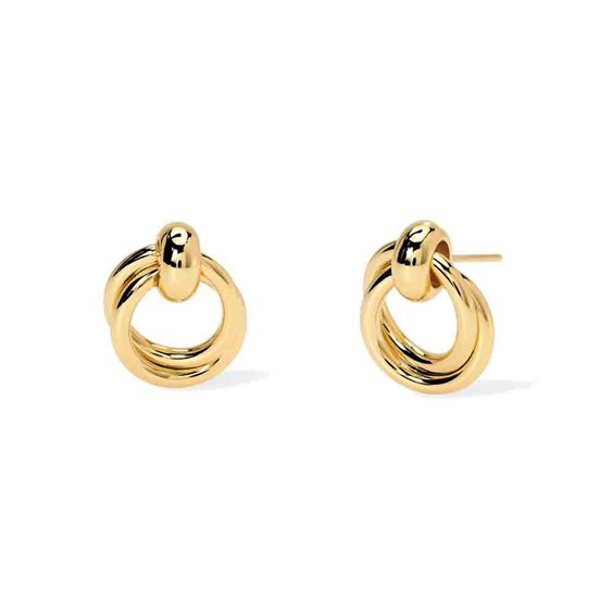 Orecchini in acciaio 316L e PVD giallo, lunghezza totale orecchino 1.7 cm, con pendente doppio cerchio. Dimensioni: larghezza orecchino 13.5 mm