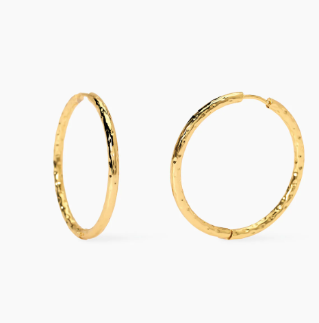 Orecchini in acciaio 316L martellato e PVD giallo semicerchio. Dimensioni: Ø esterno 35 mm, interno 30 mm