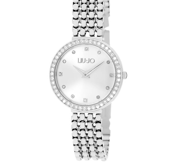 Orologio solo tempo della collezione Liu Jo Clear da donna. Colore cassa: argento; colore del quadrante: argento; colore del bracciale: argento. Cassa di diametro 28 mm in acciaio inossidabile 316L impreziosita da cristalli sulla ghiera e sul quadrante. Vetro minerale. Bracciale in acciaio inossidabile 316L con caratterizzato da una maglia elegante con chiusura deployante. Movimento al quarzo Miyota Cal. VJ20. Classificazione di impermeabilità (WR) 3 ATM: resistente agli schizzi d'acqua ed alla pioggia, ma non sotto pressione.
