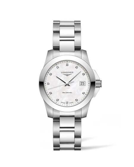 L'eleganza della performance Longines Conquest rappresenta la quintessenza dell'eleganza sportiva del marchio. Nel progettare questo modello è stata dedicata un'attenzione particolare all'estetica della lunetta, della corona con cabochon e delle maglie. Elegante connubio di performance ed eleganza, il Longines Conquest possiede tutte le caratteristiche tecniche necessarie a soddisfare le attese degli sportivi più esigenti. Al contempo sobrio e sofisticato, questo modello non mancherà di catturare l'attenzione nelle serate più chic o nelle tribune di prestigiose corse ippiche. CASSA Forma Rotonda Materiale Acciaio inossidabile Vetro Vetro zaffiro antigraffio bombato con trattamento antiriflesso multistrato sul lato interno Fondello Fondello avvitato Dimensioni Ø 34.00 mm Impermeabilità Impermeabile fino a 30 bar CARATTERISTICHE Corona a vite QUADRANTE E LANCETTE Colore Madreperla bianca Giro delle ore Indici di diamanti Lancette Lancette argentate lucide DIAMANTI Quadrante con 11 diamanti Top Wesselton VS-SI incastonati, per un totale di 0.036 carati MOVIMENTO E FUNZIONI Tipo di movimento Al Quarzo Calibro L156 Funzione Ore, minuti, secondi e data FUNZIONE SPECIALE E.O.L. CINTURINO Materiale Acciaio inossidabile Fibbia Con chiusura déployante a tripla sicurezza e meccanismo di apertura a pressione Referenza L3.377.4.87.6
