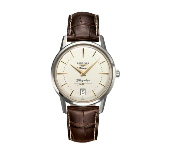FLAGSHIP HERITAGE, L4.795.4.78.2, orologio Automatico, Ø 38.50 mm, Acciaio inossidabile. Date, Movimento meccanico a carica automatica con frequenza di 28'800 alternanze orarie e riserva di carica di circa 50 ore. Medaglione in oro 18 carati con caravella, Impermeabile fino a 3 bar, Vetro zaffiro antigraffio bombato con trattamento antiriflesso multistrato sul lato interno. Quadrante Argento, Swiss Super-LumiNova®. Bracciale in Cinturino in alligatore, Con fibbia. Referenza L4.795.4.78.2