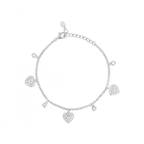 Bracciale donna , argento 925% , rodiato , catena maglia rolò , lunghezza cm 19 regolabile fino a cm 16 , cuori pendenti , zirconi bianchi incastonati , scatola e garanzia originali.