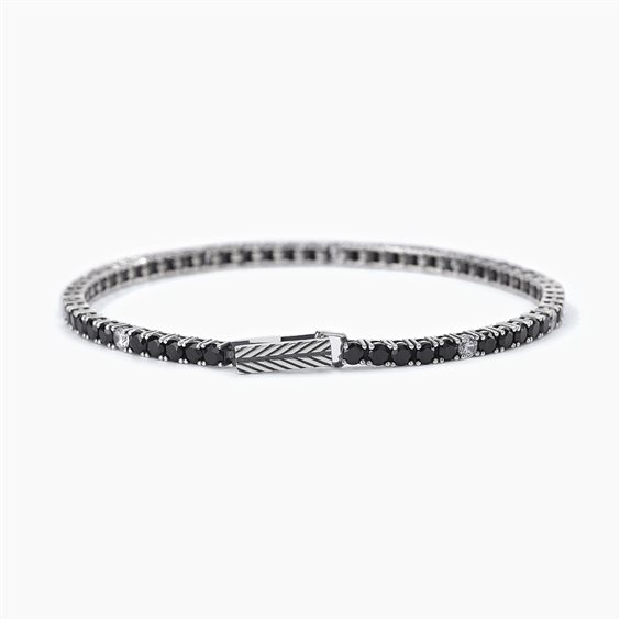 Bracciale tennis in argento 925 rodiato con zirconi neri alternati a zirconi bianchi. Chiusura pinza a molla. Misura cm 19.
