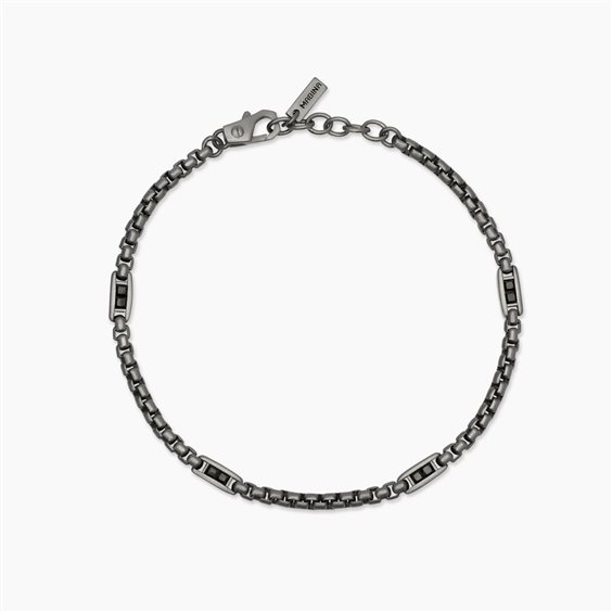 Bracciale in argento925 brunito con finitura sabbiata. Catena maglia veneta, zirconi neri taglio quadrato 2x2 mm. Lunghezza regolabile da cm 19 a cm 21.