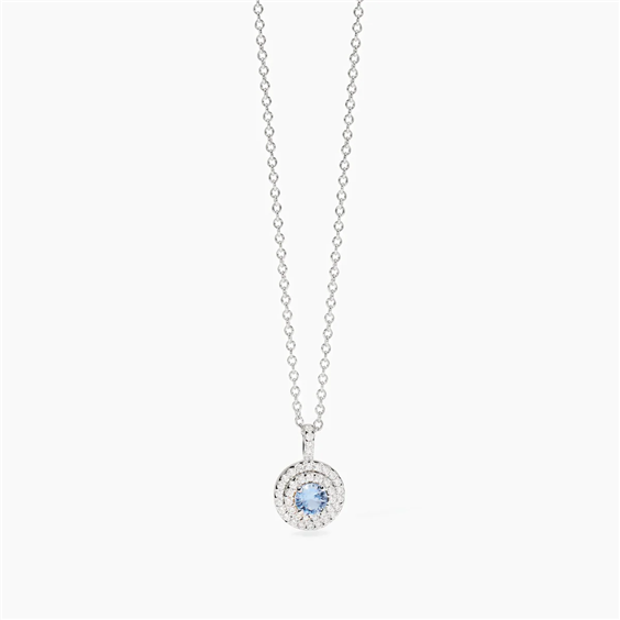 Girocollo in argento 925/°°° rodiato con catena rolò 1.5 mm e pendente Ø 11 mm con acquamarina sintetica centrale Ø 5 mm e zirconi Ø 1.25 mm, lunghezza regolabile da 39 a 43 cm