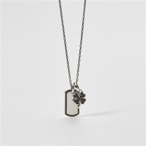 Collana in argento 925/°°° rodiato. Catena maglia forzatina. Piastra tipo "militare" mm 9,5 x 17,5 con bordo zirconi neri, ciondolo quadrifoglio con zirconi neri. Possibilità di incisione. Misura cm 50. IN CASO DI INCISIONE NON SARA' POSSIBILE IL RESO.