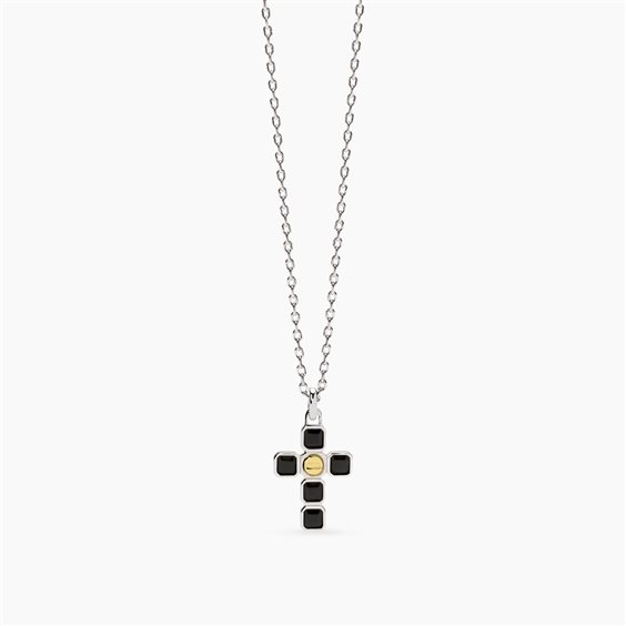 Collana in argento925, catena maglia forzatina cm 50. Ciondolo croce (cm 1,7) con inserto placcato oro giallo 18K e zirconi neri mm3x3.