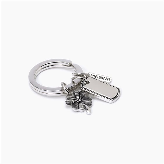 Portachiavi in argento 925/°°° rodiato con pendente quadrifoglio 14.2x11.40mm, targa 18.6x10mm