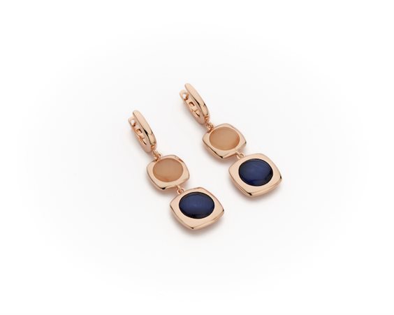 Bracciale in argento rosè con quarzo idrotermale di vari colori. Chiusura con moschettone e catenella per l'allungo. Oblò mm 16x16 e mm 13x13.