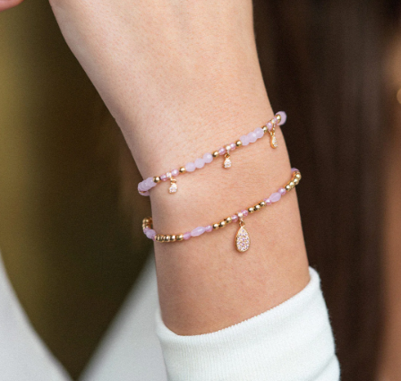 Bracciale elastico con filo di palline d'argento alternate a zirconi rosa a pietre miste rosa e tripla goccia pendente. Pavè di zirconi total pink.