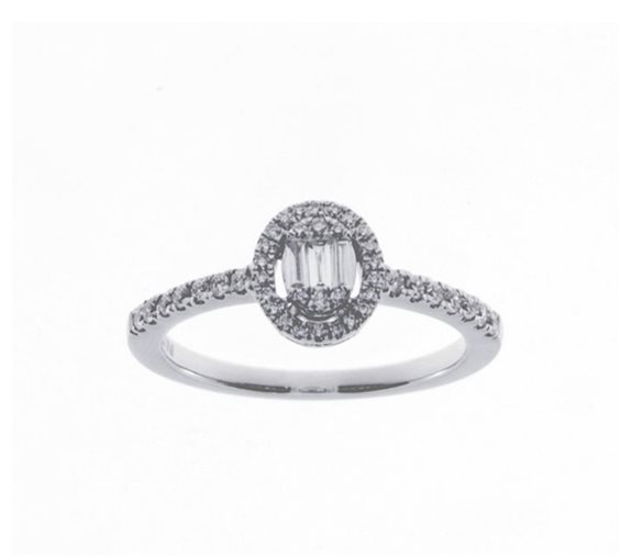 Anello della collezione Magia in oro bianco con diamante centrale a taglio a baguette di caratura 0,08 di colore G e diamanti nel contorno e nel gambo di taglio rotondo di caratura 0.27 di colore GH.