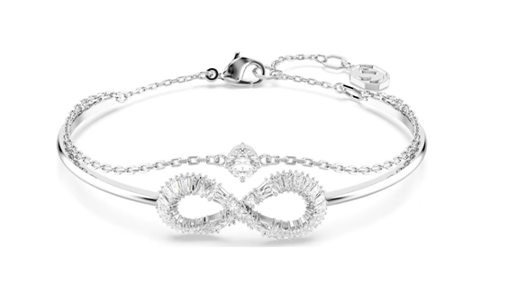 Infuso di un delicato tocco di bellezza e simbolismo, questo bangle Hyperbola può essere indossato più e più volte. Il design placcato rodio presenta una fascia rigida con motivo a simbolo dell’infinito, impreziosito da Swarovski Zirconia trasparenti. Vi è stata inoltre aggiunta una seconda catenina, con un singolo Swarovski Zirconia rotondo incastonato al centro. Uno straordinario bangle a doppio giro che ti accompagnerà con disinvoltura dalla mattina alla sera. Immagini a scopo illustrativo.