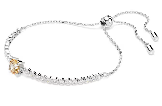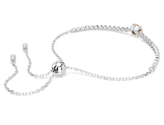 Fresca interpretazione del classico bracciale Tennis, questa creazione Matrix abbina Swarovski Zirconia trasparenti ad una brillante nota di colore. Dotato di una chiusura scorrevole, il gioiello placcato rodio presenta una fila uniforme di Swarovski Zirconia trasparenti, impreziosite da una Swarovski Zirconia champagne dal taglio Round al centro. Una creazione dalla gioiosa luminosità che saprà conferire una nota di lusso a qualsiasi outfit. Articolo nr.: 5690694 Collezione: Matrix Lunghezza massima: 24 cm Dimensione decorazione: 0.4 x 0.6 cm Materiale: Cristalli, Placcatura rodio, Zirconia Colore: Giallo Tipo di fermaglio: Sfera scorrevo