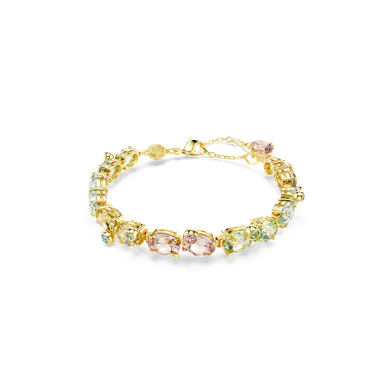 Con una scintillante collisione di colori, questo luminoso bracciale Gema è perfetto per un’espressione di sé giocosa. Il design placcato in tonalità oro presenta una fila di grandi cristalli in molteplici tonalità vivaci, circondati da cristalli più piccoli in un’allegra montatura a griffe a bolle. Le magistrali sfaccettature e le vivaci combinazioni di colori aumenteranno istantaneamente l’energia e la luce del tuo stile. Abbinalo a un pendente coordinato per elevare con audacia qualsiasi outfit. Articolo nr.: 5705808 Collezione: Gema Lunghezza (minima - massima): 15.5 - 20 cm Dimensione decorazione: 0.8 x 0.9 cm Materiale: Cristalli, Placcato color oro Colore: Multicolore Tipo di fermaglio: Moschettone
