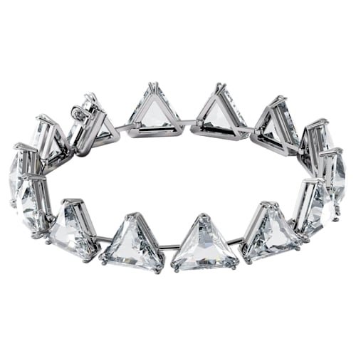 Questo bracciale sfoggia tutta la magia del taglio di precisione, grazie alla sua fila uniforme di cristalli taglio triangle, incastonati in una struttura placcata in rodio. Questa nuova creazione nasce per essere il gioiello da indossare in ogni occasione e con ogni look, sia abbinato con altre creazioni della famiglia Millenia o da solo. Parte della famiglia Millenia, questo bracciale è ideato dalla Direttrice Creativa Giovanna Engelbert per la Collection II. Come chiuderla e aprirla: posizionare l'elemento di fissaggio nel punto più largo del foro opposto e farlo scorrere fino al punto più basso. Una volta posizionato, abbassare il fermo di sicurezza dell'anello a D sulla parte superiore per bloccare il fissaggio. Per aprire, sollevare il fermo di sicurezza dell'anello a D e far scorrere il testimone verso il punto più largo per sganciarlo. Immagini a scopo illustrativo.