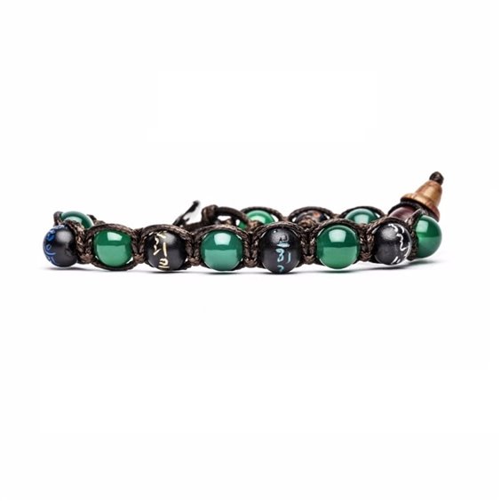 Pietre 8 mm La collezione Mantra rappresenta una serie speciale Tamashii. Le pietre sono intercalate con grani in legno autentico orientale (hua-qi-nanmu) inciso e dipinto a mano con sinboli del Mantra.Tamashii Tradizionale AGATA VERDE L’agata è una pietra presente in natura in vari colori. In questo caso nella variante verde identifica il colore della natura, degli alberi e delle piante. Riassume le qualità di equilibrio e di armonia, ma anche di vigore giovanile e di azione. Il Tamashii in agata verde trasforma la gelosia in saggezza di realizzazione.