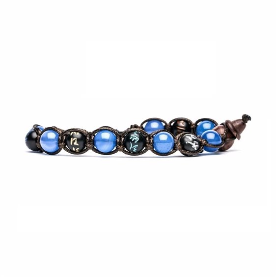 In Tibet i gioielli hanno un forte valore simbolico e tramandano valori culturali e religiosi antichissimi. Nella tradizione buddhista le gemme e i gioielli servono come metafore per gli ideali della fede ed esprimono misteriose condizioni spirituali e attributi interiori nascosti. Tamashii è un gioiello composto da pietre naturali e viene utilizzato dai monaci tibetani per le pratiche religiose e come talismano. Infatti Tamashii significa “anima” e il termine deriva da tama che significa “gioiello”, quindi “gioiello dell’anima”. Chi lo indossa persegue un ideale di pace e di amore verso se stesso ed il mondo e il bracciale aiuta a proteggere la sua anima, a farla crescere, farle trovare un ruolo e un senso della vita. Questo bracciale è stato realizzato in Tibet ed è benedetto da monaci buddisti. TAMASHII MANTRA Pietre 8 mm La collezione Mantra rappresenta una serie speciale Tamashii. Le pietre sono intercalate con grani in legno autentico orientale (hua-qi-nanmu) inciso e dipinto a mano con simboli del Mantra.AGATA BLU Il blu è il colore più importante nel buddismo, più dell’oro. Identifica l’ascensione e la saggezza, la verità, la devozione, la fede, la purezza, la castità, la pace, la vita spirituale e intellettuale, Il Tamashii in blu tradizionalmente è usato per identificare ciò che è puro o raro. Calma l’ira trasformandola in saggezza.