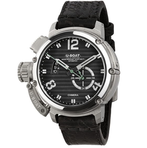 MOVIMENTO svizzero meccanico automatico ETA 2824 Top Soigné, elaborato e modificato su specifiche U-BOAT. Frequenza 28.800 alternanze/ora, (4 Hz). Riserva di carica 38 ore. 25 rubini. Rotore U-BOAT in ottone e tungsteno, lavorazione perlage e rodiatura. Ponti avvitati. FUNZIONI ore, minuti, secondi, datario, indicatore 24h. Leva di estrazione della corona brevettata, posizionata a ore 10 (Crown Release System). CASSA realizzata in acciaio AISI 316L. La chiusura tra lunetta in tungsteno lucida e fondello avviene tramite tiranti esterni vincolati al fondello. Viti tiranti di tipo speciale con chiave personalizzata. Copricorona a vite di grandi dimensioni per garantire una massima impermeabilità. Diametro 46 mm. FONDO chiuso con 5 tiranti avvitati alla ghiera con apertura in vetro minerale fumé per vista movimento. QUADRANTE a due livelli sovrapposti. Parte superiore in metallo striped dial verniciato nero. Numeri, indici e indicatore con taglio laser. Parte inferiore in metallo spazzolato. Sfere ore e minuti in metallo spazzolato e verniciato con taglio laser. Sfera secondi e indicatore 24h in metallo spazzolato e verniciato. VETRO superiore ottico in zaffiro di altissima qualità con trattamento antiriflesso.